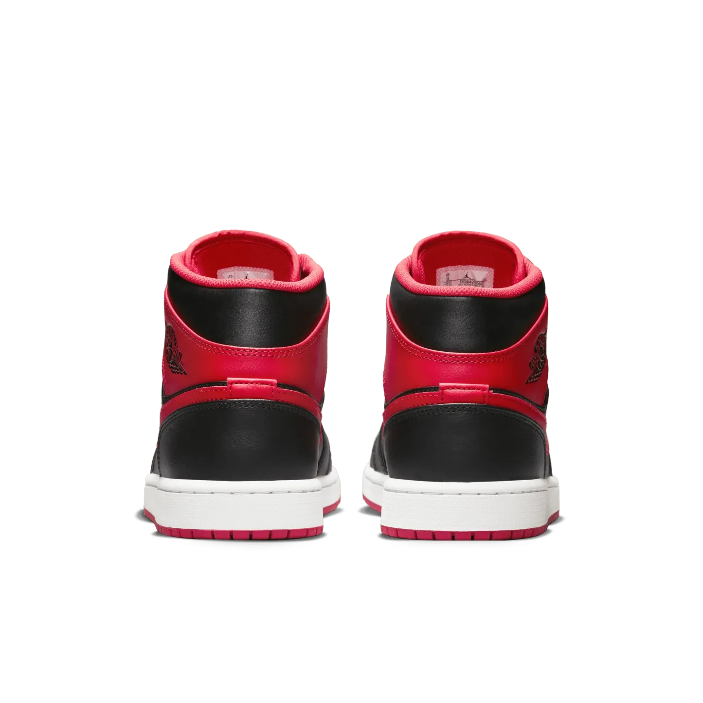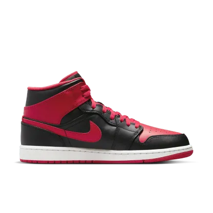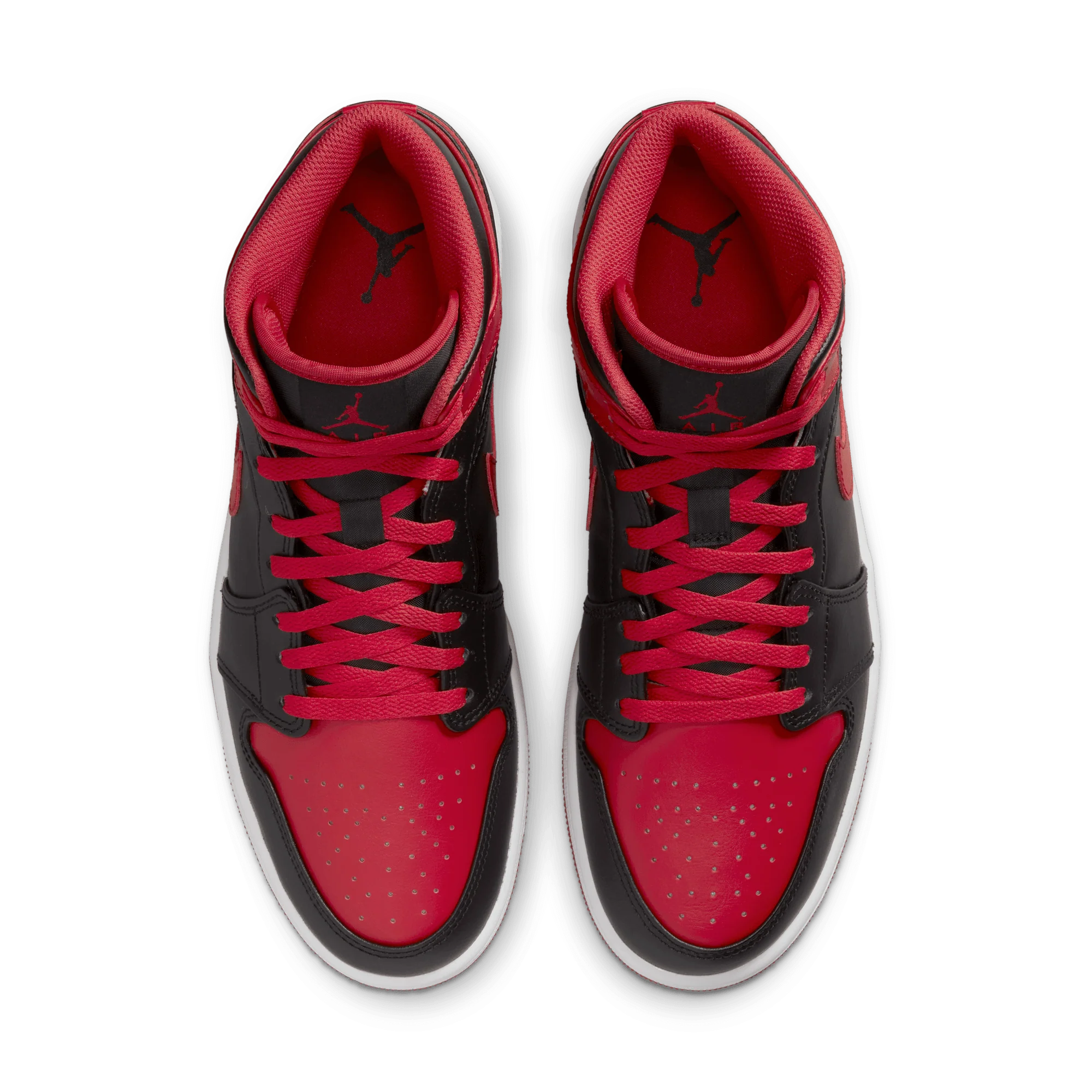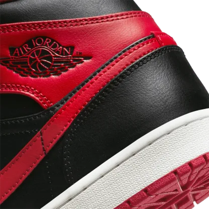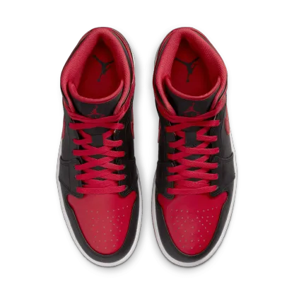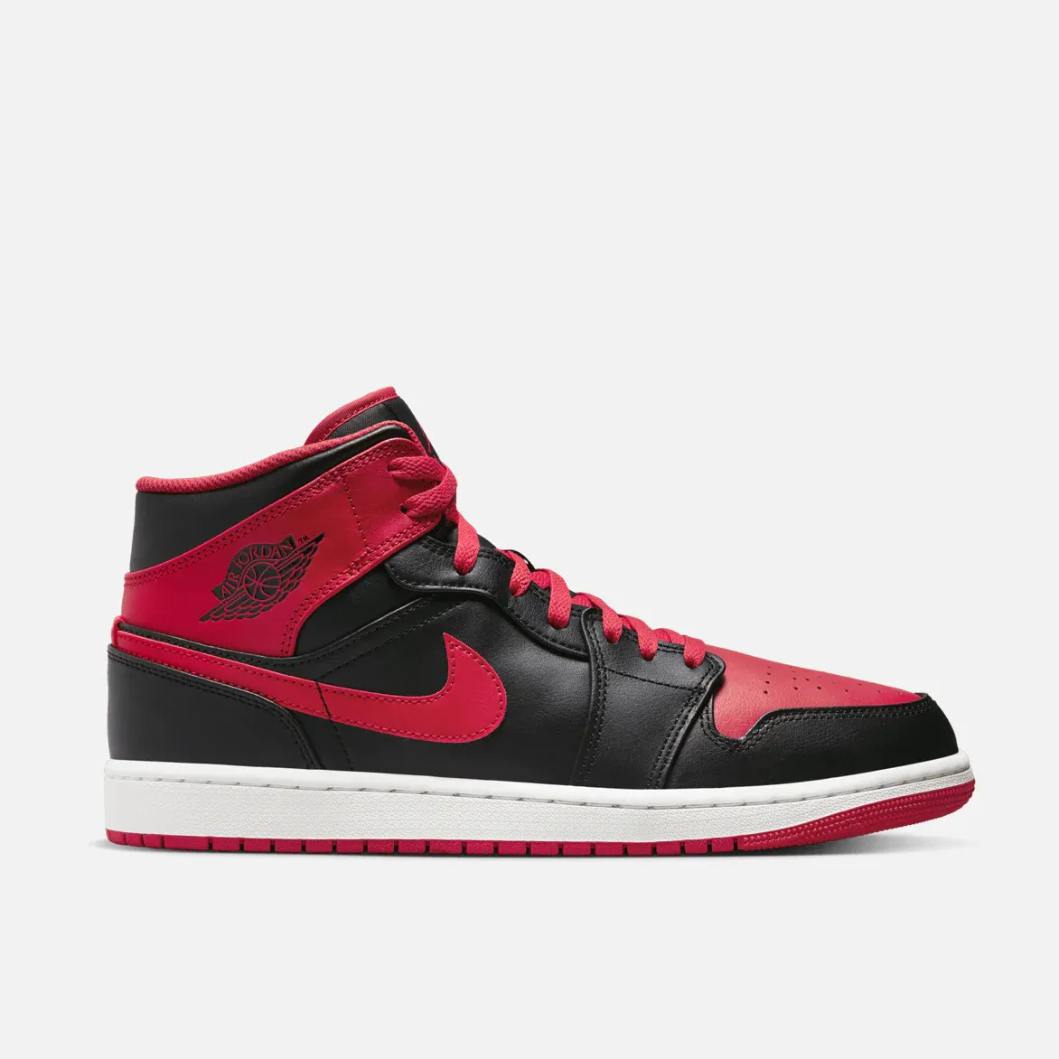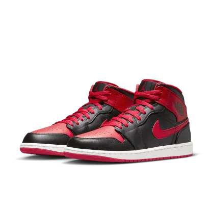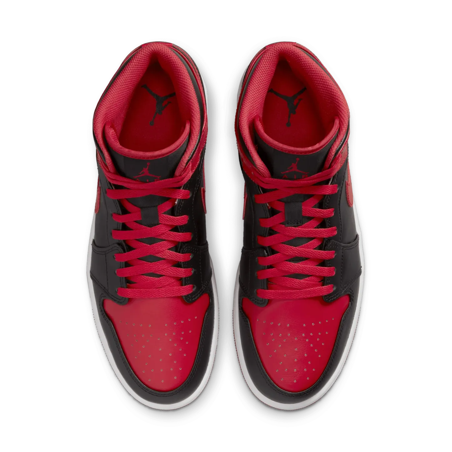 The most famous colorway of the AJ1 gets flipped on the this new mid top release, the Air Jordan 1 Mid "Alternate Bred". The full-grain leather upper switches up the iconic color blocking with red on the toe, ankle, tongue and swoosh, and black covering the rest of the full-grain leather upper. A black and red Jumpman tongue tag, debossed black "Wings" logo on the ankle, white rubber midsole capped with a red rubber outsole, and a red lining and laces complete the new look.