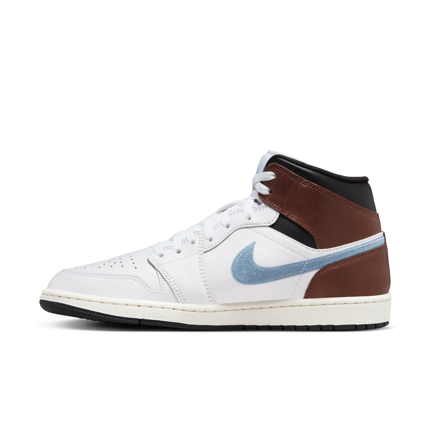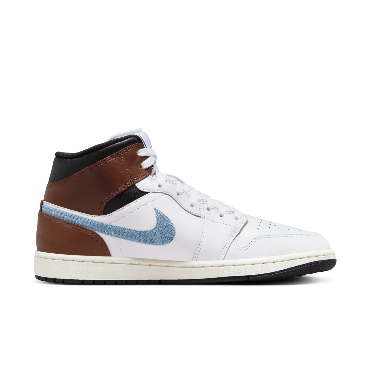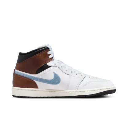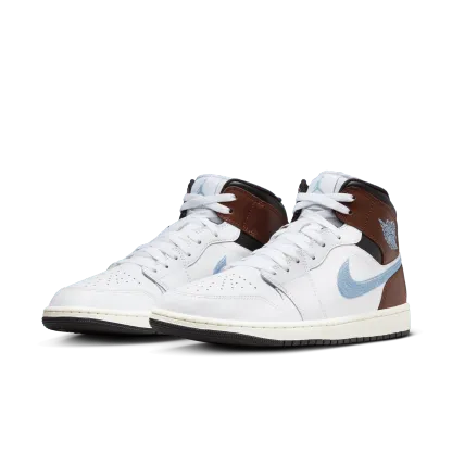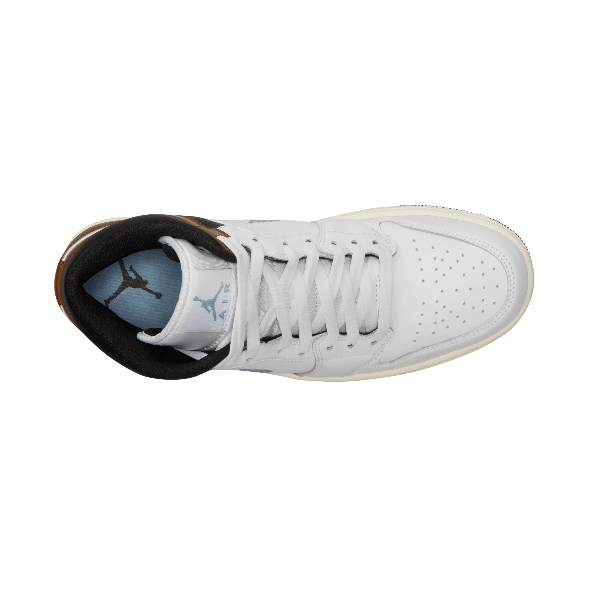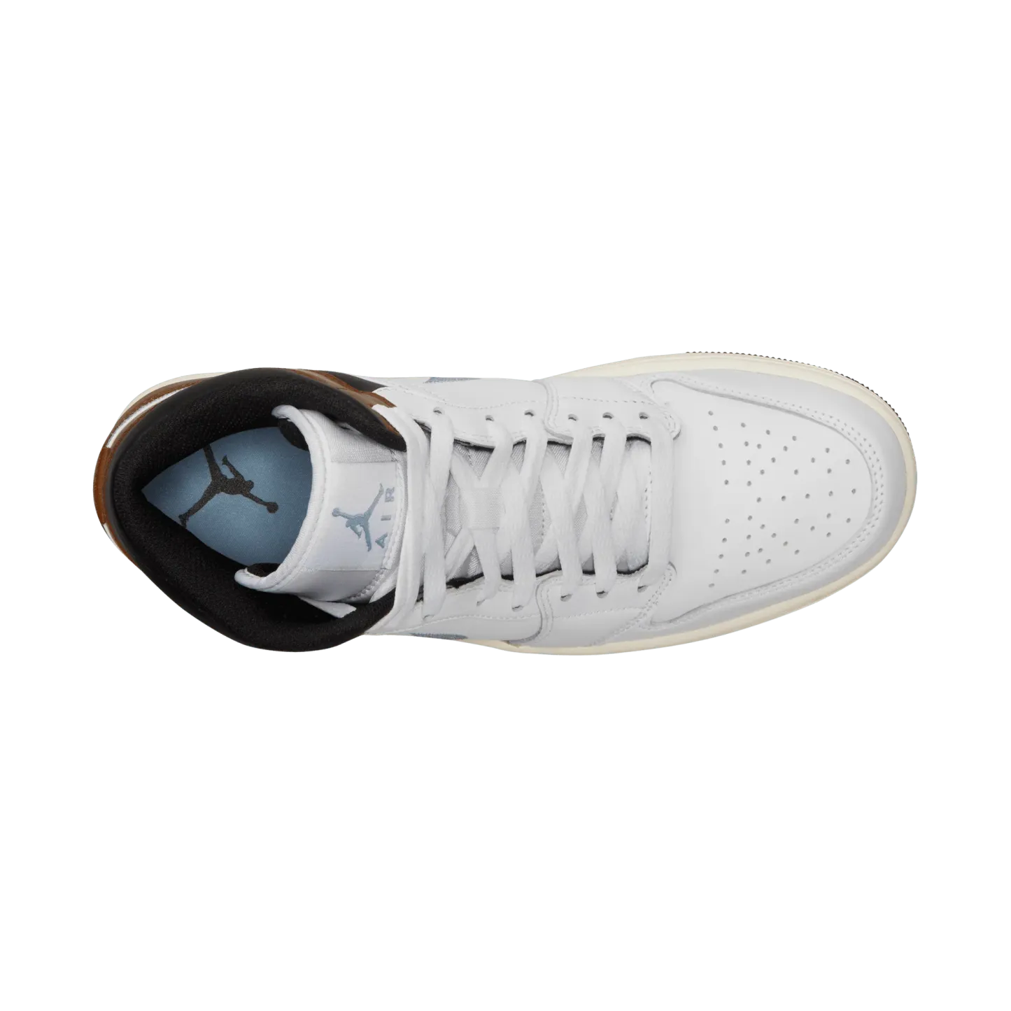 The mid top version of the original Air Jordan embodies everything you love about the Air Jordan 1 MID. This "White / Blue Grey" colorway layers different shades of brown and on top of a white body with brown and blue grey Jumpman tongue tag, leather swoosh and "Jordan Wings" logo on the ankle filling in the details. The white rubber midsole contains an Air-Sole unit in the heel and is capped off with a black outsole.