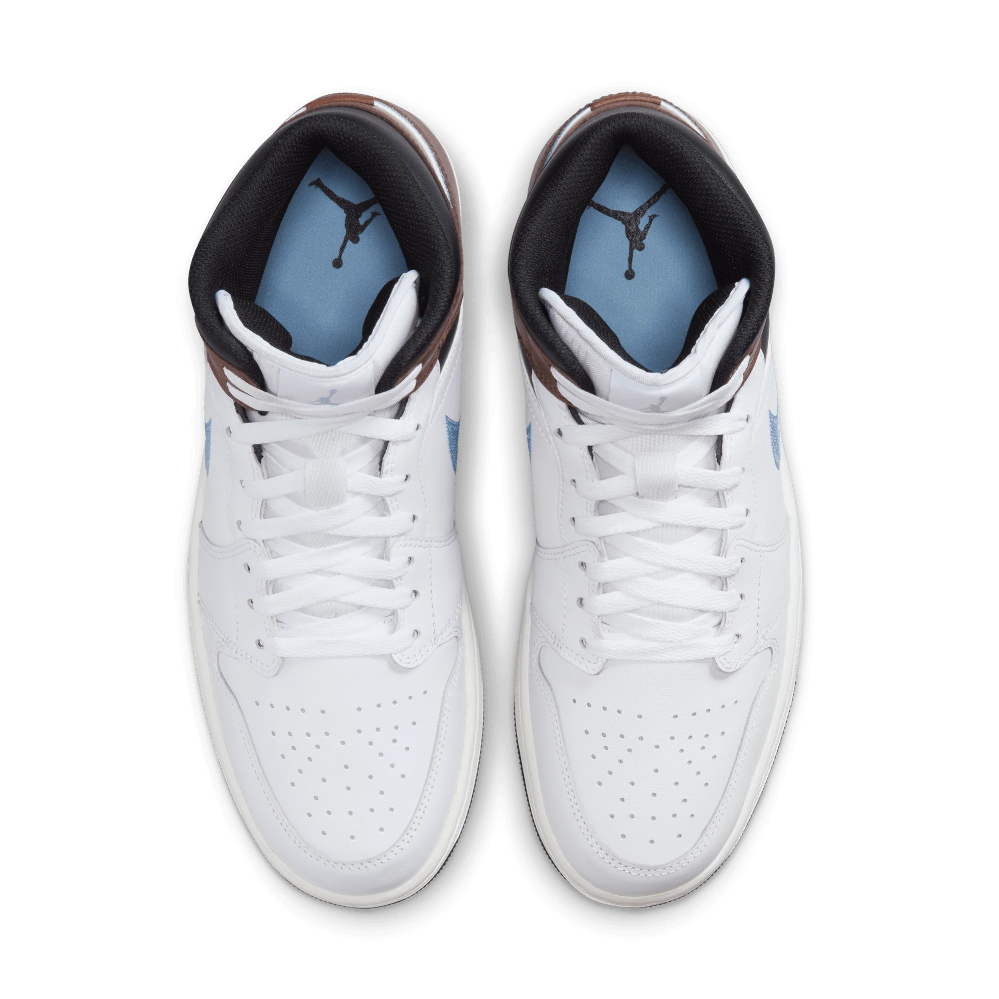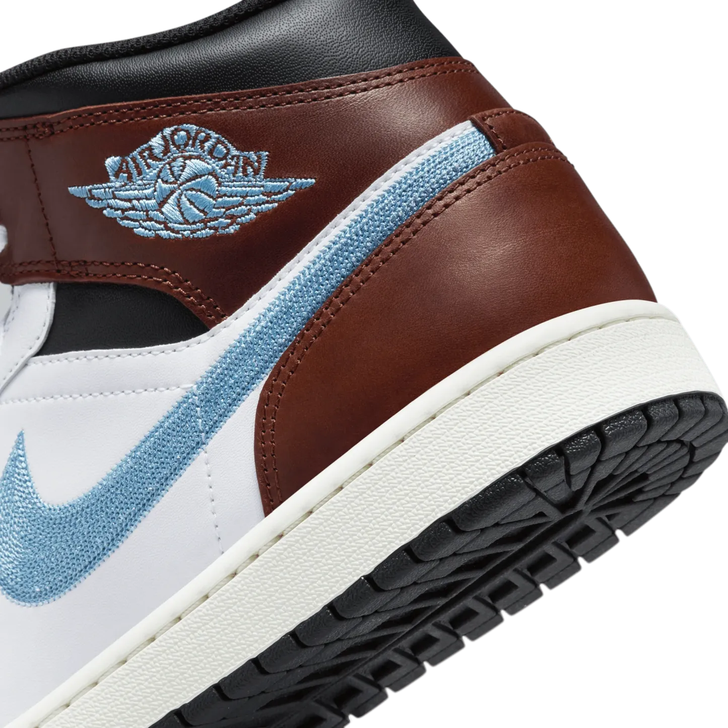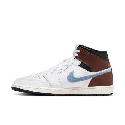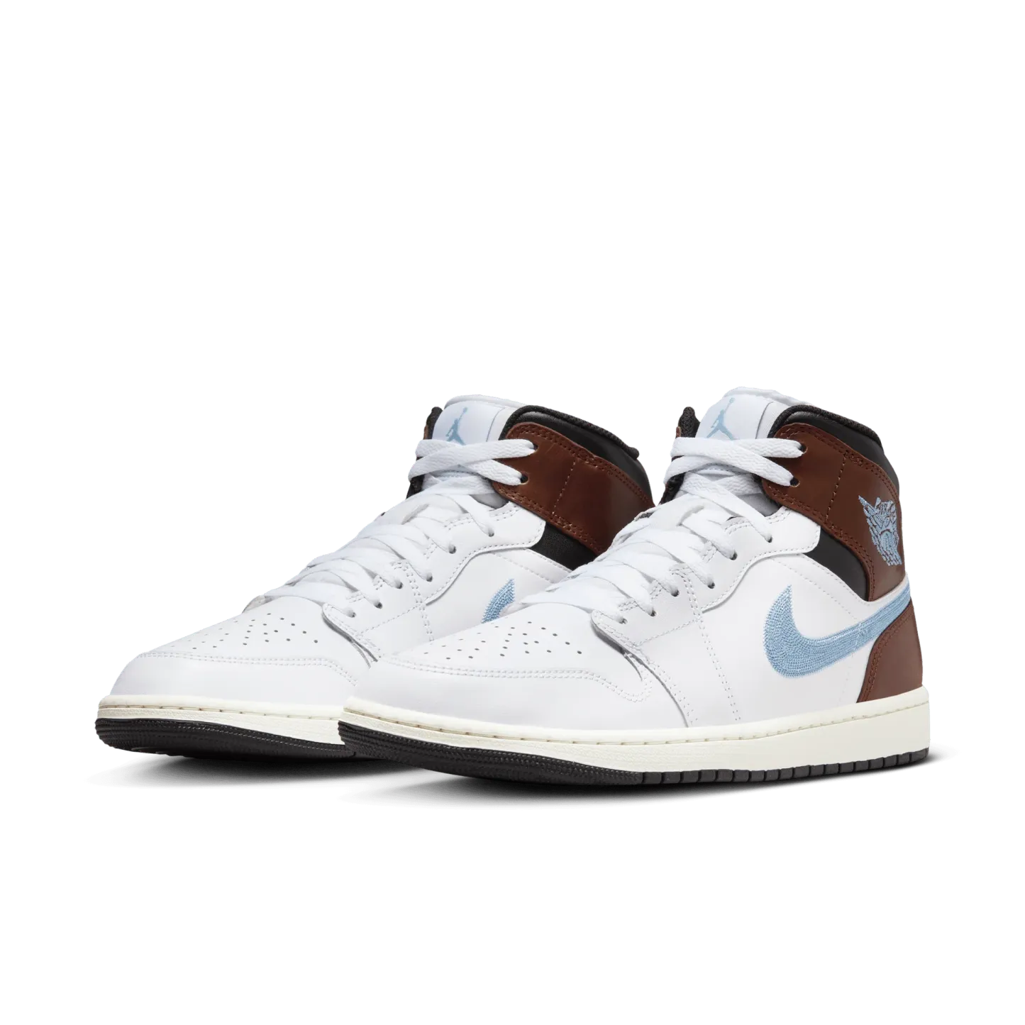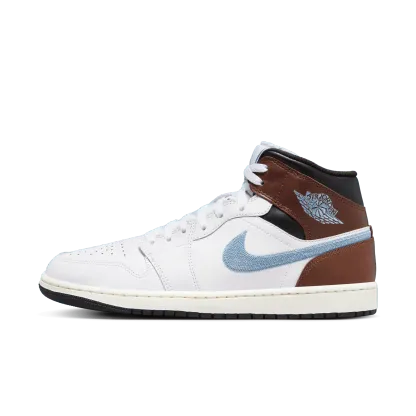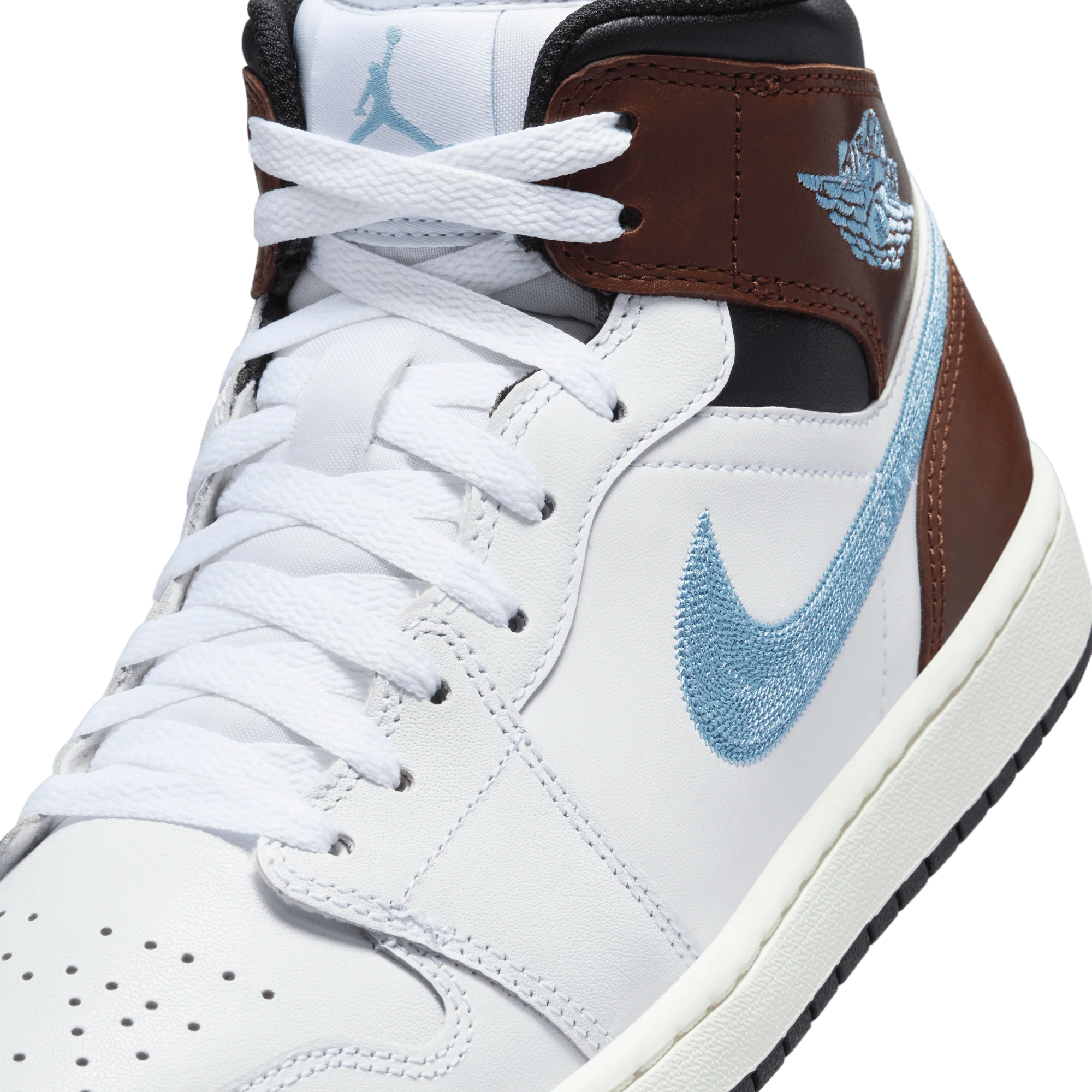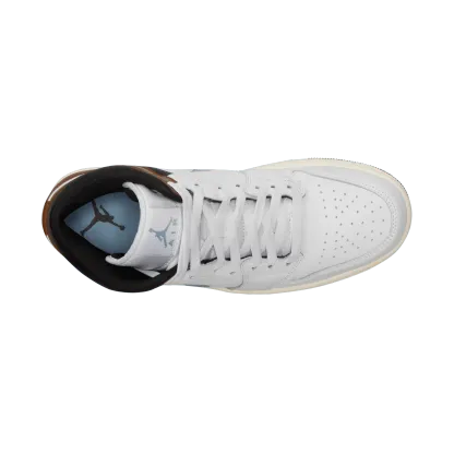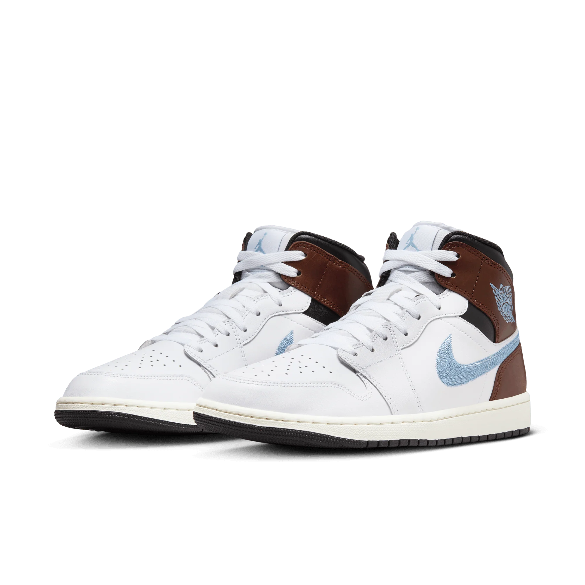 The mid top version of the original Air Jordan embodies everything you love about the Air Jordan 1 MID. This "White / Blue Grey" colorway layers different shades of brown and on top of a white body with brown and blue grey Jumpman tongue tag, leather swoosh and "Jordan Wings" logo on the ankle filling in the details. The white rubber midsole contains an Air-Sole unit in the heel and is capped off with a black outsole.