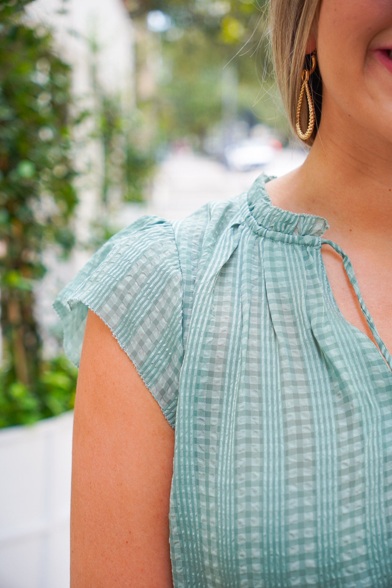 Feminine and chic, our Lolita Top is the perfect addition to your wardrobe. Crafted with airy, slightly sheer fabric and delicate trim framing a v-neckline, it features small flutter sleeves for a graceful, timeless look. It is in a beautiful sage green color with a checkered patter all around.?It has self tie strings adding an elegant touch to any ensemble! It is a full length top, is lightweight, slightly sheer, and fits true to size.