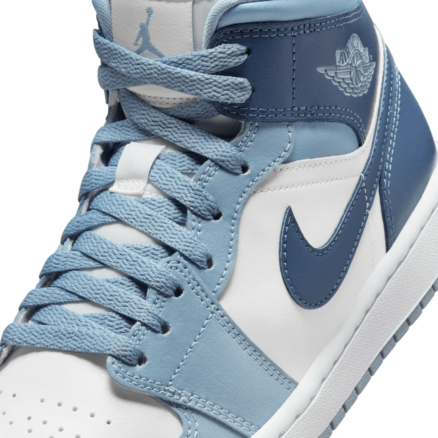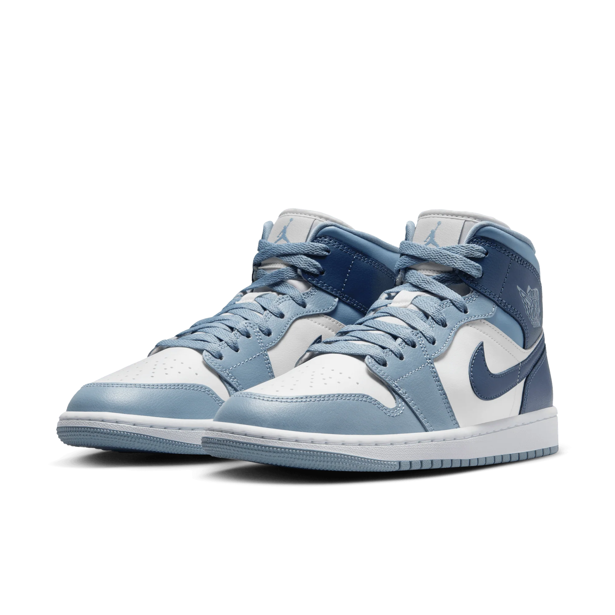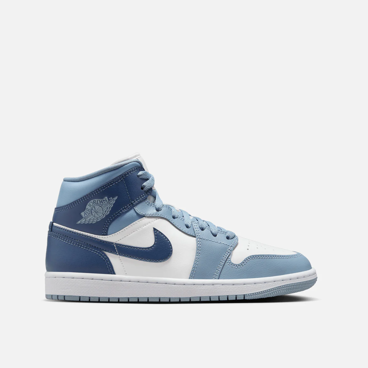The mid top version of the original Air Jordan embodies everything you love about the Air Jordan 1. This version of the classic silhouette features a white leather upper with a blue wash overlaid across the whole of the silhouette. It features hits of the strong french blue color across the branding, laces and interior of the shoe. A white midsole and matching sky j french blue wash outsole finishes off the look of this AJ1 Mid.