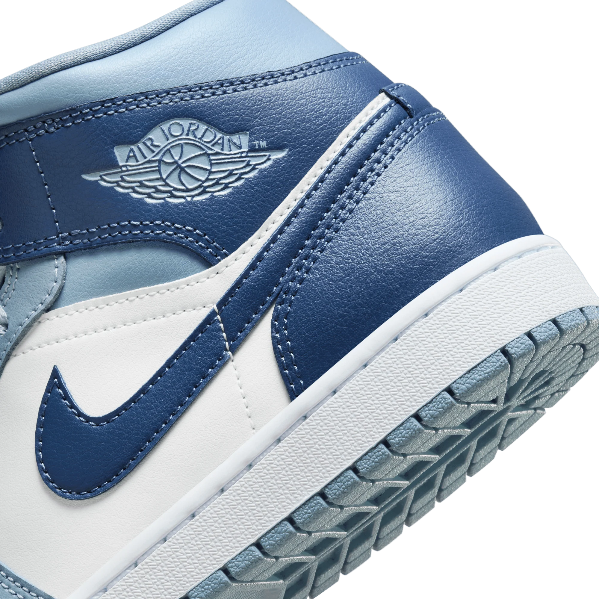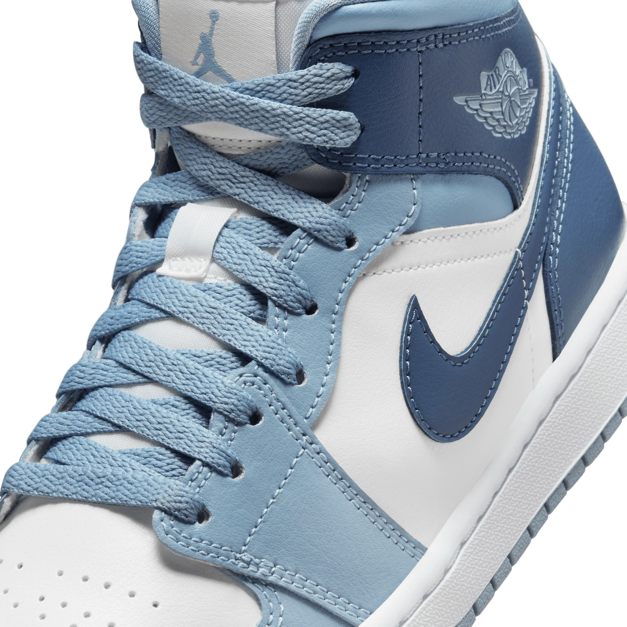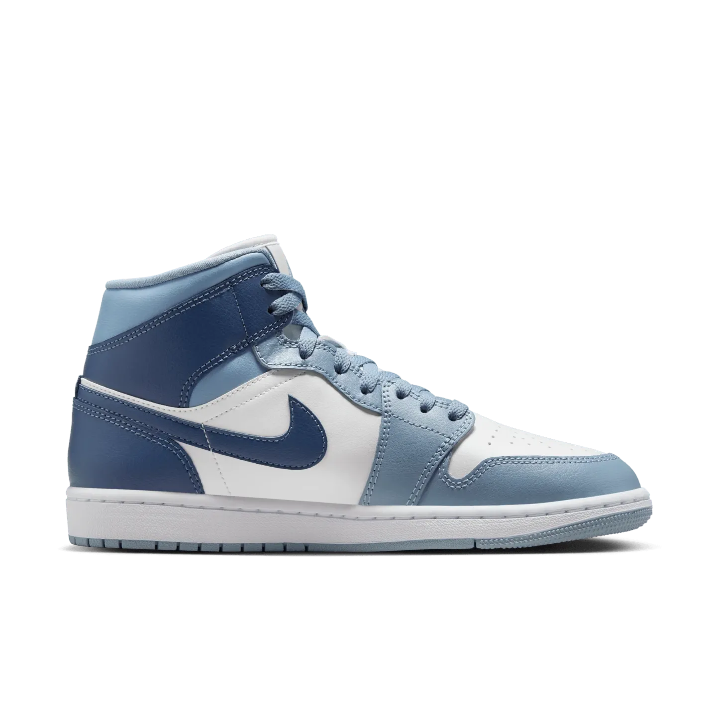 The mid top version of the original Air Jordan embodies everything you love about the Air Jordan 1. This version of the classic silhouette features a white leather upper with a blue wash overlaid across the whole of the silhouette. It features hits of the strong french blue color across the branding, laces and interior of the shoe. A white midsole and matching sky j french blue wash outsole finishes off the look of this AJ1 Mid.